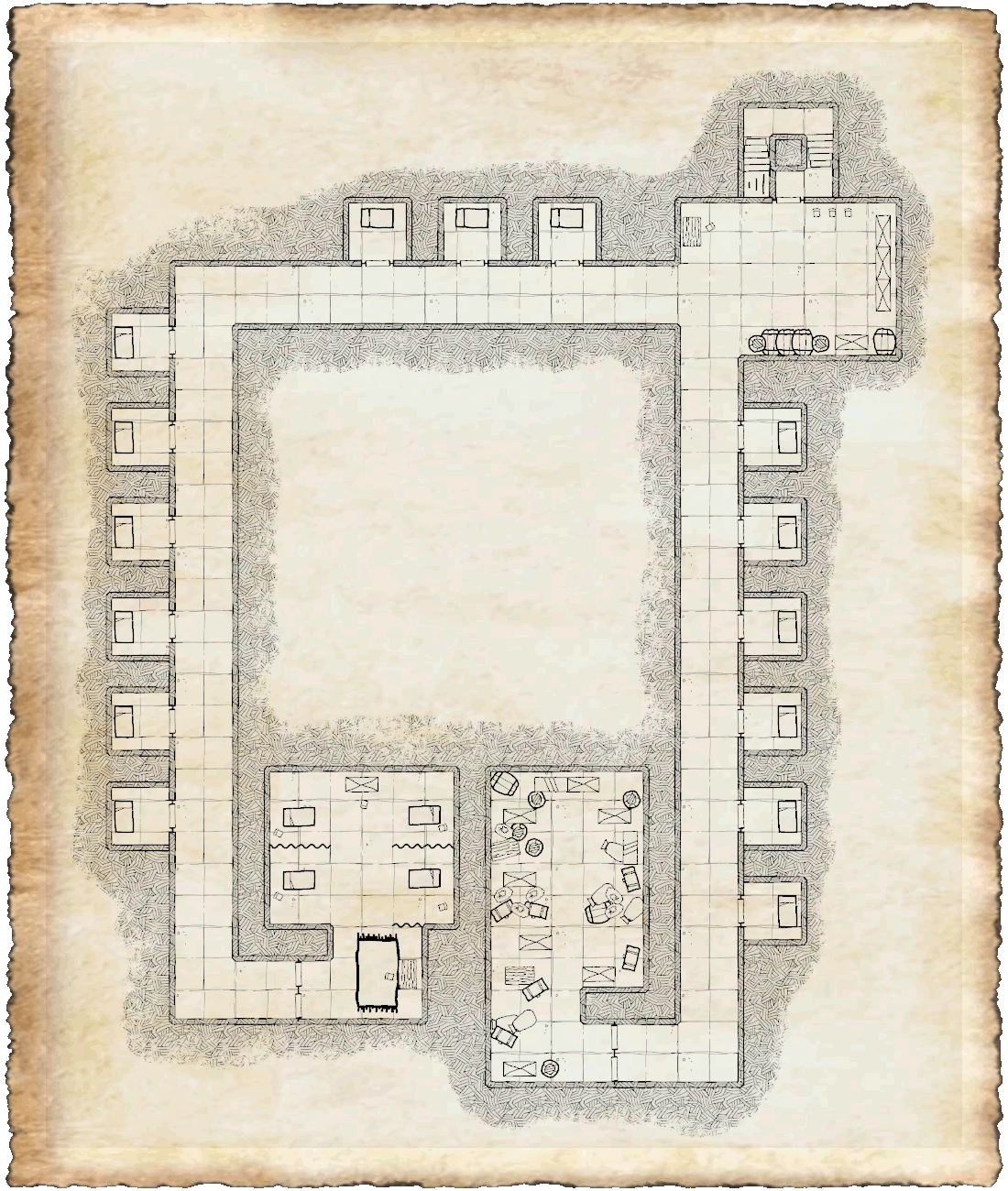 Während die anderen Sterblichen nach dem Akt des Gebets den Speisesaal betraten, begab sich Gieselhold, in die finsteren Tiefen des Kellers. Dort angekommen, nahm er sich einen Moment, um einen groben Überblick über die mysteriösen Räume zu gewinnen. Von der Treppe aus betrachtet, offenbarte sich ihm auf der linken Seite des nach Süden führenden Kellergangs, eine Reihe von Zimmern: Belegt, frei, frei, Belegt (von Alinja, dies wusste Gieselhold aber da noch nicht), frei, frei, Waffenkammer. In dem nach Westen führenden Gang, der nach ca. 20m auch nach Süden abbog, auf der rechten Seite war die Aufteilung wie folgt: Belegt (Paale), Belegt (von einem Mann) Frei, Frei, Belegt (von Fetanka), Frei, Frei, Frei, Frei, Behandlungszimmer.