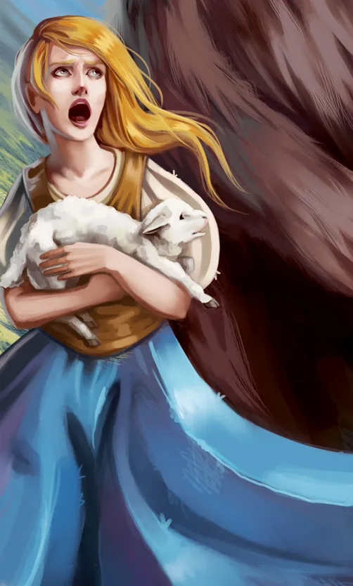 Auf ihren Armen trägt sie ein Lamm. Irgendwie scheint sie auch verletzt zu sein...humpelnd rennt sie den Helden entgegen. Kurz darauf bricht ein Bär auch aus dem Unterholz...ob erfreut jetzt noch mehr Futter gefunden zu haben tut nichts zur Sache. In einem Kampf, den die beiden mit Ihren Fackeln führen (beide sind davon überzeugt, dass Bären Feuer nicht mögen) schaffen sie es den Bären zu verscheuchen. Jetzt nehmen Sie sich Zeit für das Schafhirtin. Sie ist schwer verletzt. Irmi ist ihr Name. Sie kommt aus dem nahen Dorf Altenbrück, keine 30 Minuten von hier. Nachdem die beiden gemeinsam die Wunden versorgt haben (mehr schlecht als recht) und – nach einer Diskussion mit der paiosgetreuen Irmi („kann Praios das gutheißen, wenn ihr verehrter Herr Magus mich mit Zauerberei und solchen Dingen heilen wollte? Reicht nicht der Verband? Wunden heilen doch auch mit der Zeit. Ist nicht so schlimm. Ich schaff das schon…“) - heilt Ismir ihre ein paar Verletzungen, sodass sie jetzt wieder halbwegs unbeschwert laufen kann.
